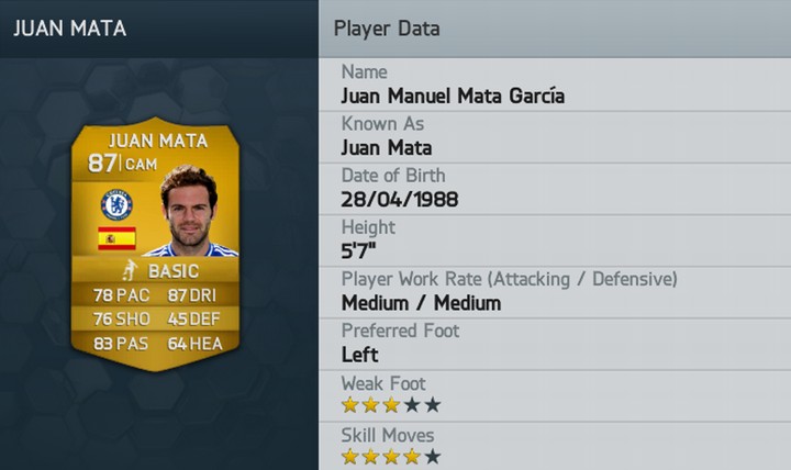 Juan Mata FIFA 14 Rating Published September 5, 2013 at 720 × 428 in Top 50 FIFA 14 Player Ratings Exposed ← Previous Next → Juan Mata FIFA 14 Rating Check out Juan Mata’s Rating for this year in full