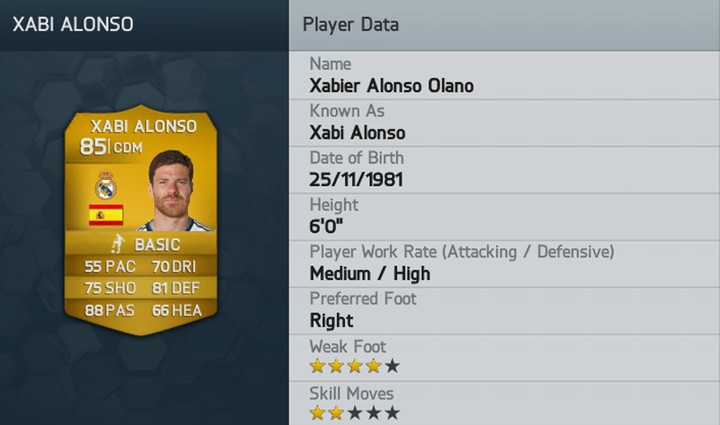 Xabi Alonso FIFA 14 Rating Published September 5, 2013 at 720 × 425 in Top 50 FIFA 14 Player Ratings Exposed ← Previous Next → Xabi Alonso FIFA 14 Rating See Spanish and Real Madrid star Xabi Alonso’s FIFA 14 Rating