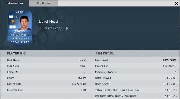 Lionel Messi TOTY Published January 24, 2014 at 599 × 331 in The FUT 14 TOTY Officially Revealed ← Previous Next → Lionel Messi TOTY Lionel Messi TOTY stats for FUT 14