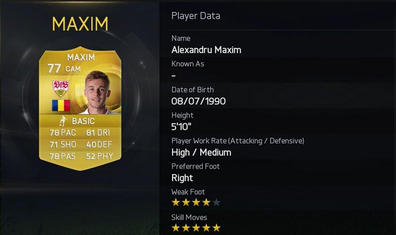 Alexandru Maxim Published September 17, 2014 at 805 × 478 in Full List Of Five-Star Skill Players On FIFA 15 ← Previous Next → Alexandru Maxim Alexandru Maxim has five* skill moves on the FIFA 15 game
